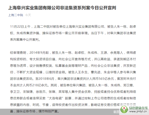 11月22日上午,上海二中院對(duì)阜興集團(tuán)、被告人朱一棟、趙卓權(quán)、朱成偉集資詐騙、操縱證券市場(chǎng)一案公開(kāi)開(kāi)庭審理。當(dāng)日下午,對(duì)阜興集團(tuán)非法集資系列案集中公開(kāi)宣判。