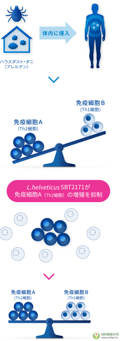 經(jīng)典的“衛(wèi)生假說(shuō)”認(rèn)為過(guò)敏性疾病是因?yàn)轶w內(nèi)免疫細(xì)胞(更多的Th2細(xì)胞和更少的Th1細(xì)胞)失衡引起的變態(tài)免疫反應(yīng),從而引發(fā)流鼻涕和打噴嚏等反應(yīng)。實(shí)驗(yàn)進(jìn)行L.helveticusSBT2171干預(yù)后,研究結(jié)果證實(shí),它可以有效的抑制Th2細(xì)胞的增加,使得Th2細(xì)胞和Th1細(xì)胞處于平衡狀態(tài),改善整體過(guò)敏癥狀,減少眼鼻不適。