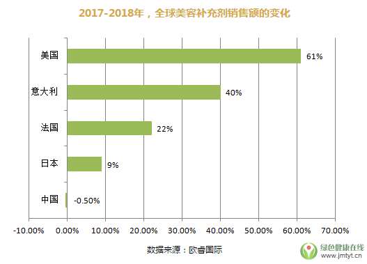 歐睿國際(Euromonitor International)調(diào)查數(shù)據(jù)顯示,2017年美國全年的銷售額不過8900萬美元,但在2018年美容補充劑產(chǎn)品銷售額達到了1.44億美元。其中2017年全球新推出的美容補充劑中,定位為美容產(chǎn)品的的維生素和膳食補充劑,日本占了20%,英國為11%,韓國為8%,美國為7%。