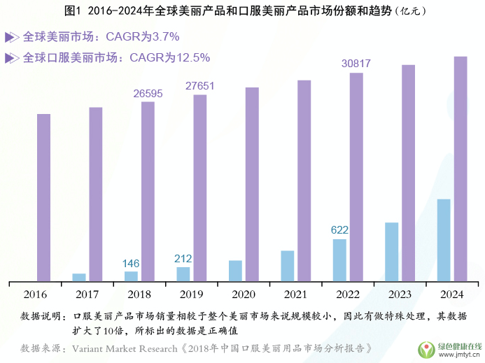 根據Variant Market Research 發布的《2018年中國口服美麗用品市場分析報告》顯示,2019年口服美容品市場只占全球美麗整體市場的0.7%,仍有較大的提升空間,預計到2022年全球口服美容品市場總額將達到622億元。