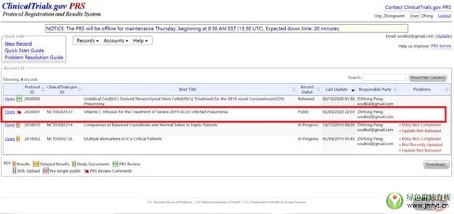 彭志勇教授團(tuán)隊(duì)大劑量維生素C治療新冠肺炎臨床試驗(yàn)在美國(guó)臨床試驗(yàn)Clnicaltrials.gov網(wǎng)站上登記