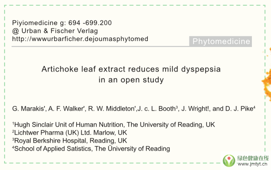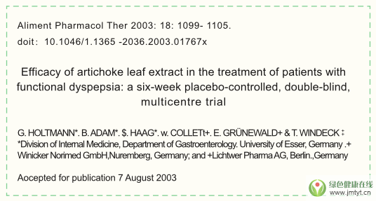 2、對朝鮮薊葉提取物治療功能性消化不良患者的作用:6周安慰劑照,雙盲,多中心試驗