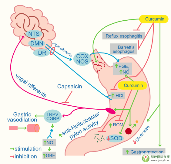 近幾年大量的研究表明姜黃素可保護食道免受反流性食管炎和胃粘膜損傷;保護由非甾體抗炎藥引起的胃部損傷,以及對幽門螺旋桿菌引起的胃炎和胃潰瘍有抑制作用。