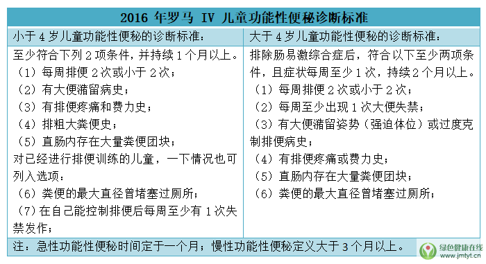 功能性便秘是指非全身疾病或腸道疾病所引起的原發(fā)性持續(xù)便秘,又稱(chēng)習(xí)慣性便秘或單純性便秘。主要表現(xiàn)為排便次數(shù)減少、大便干硬、排便困難、大便失禁、腹痛等一系列癥狀。羅馬Ⅳ兒童功能性便秘的診斷標(biāo)準(zhǔn)如下: