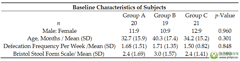 研究人員從日本的五個(gè)兒科門(mén)診招募受試者60名(年齡在6個(gè)月至6歲之間,且被診斷為功能性便秘),隨機(jī)分為三組,A組(n=20)接受益生菌和作為氧化鎂安慰劑的乳糖水合物,B組(n=19)接受益生菌和氧化鎂,C組(n=21)接受益生菌和氧化鎂安慰劑;益生菌以油懸浮液形式出現(xiàn),在每天兩次喂食后30分鐘以5滴形式給藥,氧化鎂每天服用30毫克/千克,通過(guò)日記記錄消費(fèi)者的排便頻率和糞便濃度,持續(xù)四周。