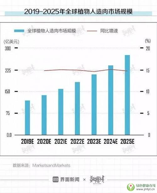 市場研究機(jī)構(gòu)FAIRR報告顯示,自2010年以來,植物性肉類替代品的全球年銷售額平均每年增長8%。目前,增長率約為加工肉類產(chǎn)量的兩倍,年銷售額約為20億美元。到2020年,植物肉類市場將達(dá)到52億美元。