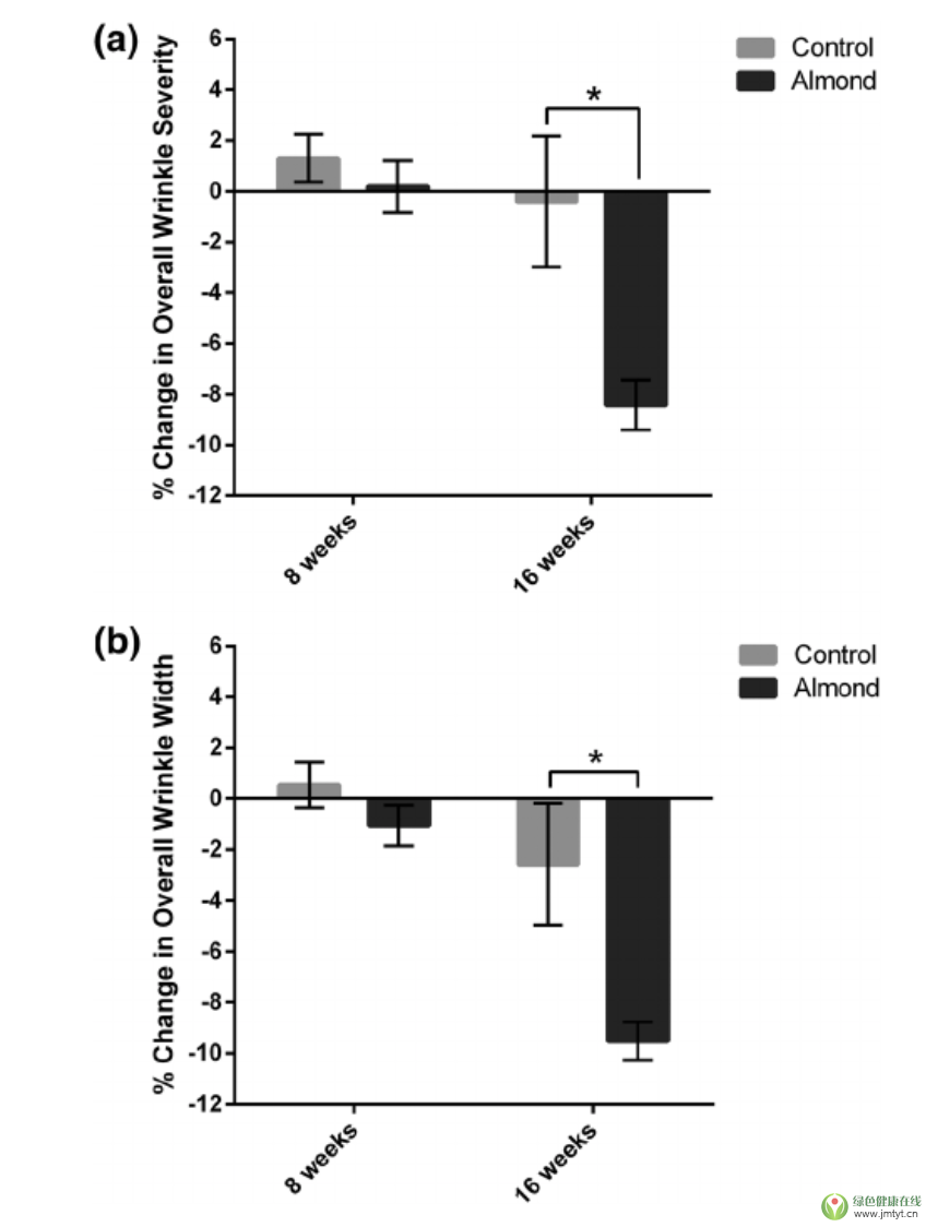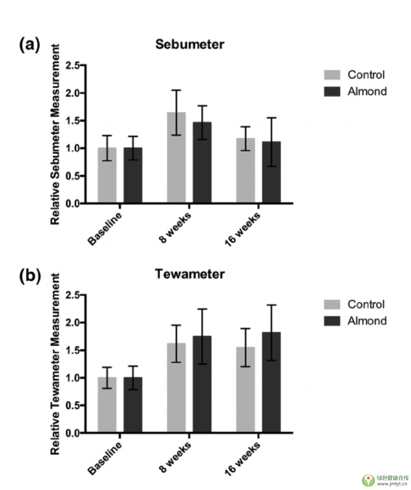 結果顯示,在基線,第8周和第16周,加州巴旦木組和對照組之間(a)皮脂(b)表皮水分流失的變化在三個時間點并沒有顯著差異。