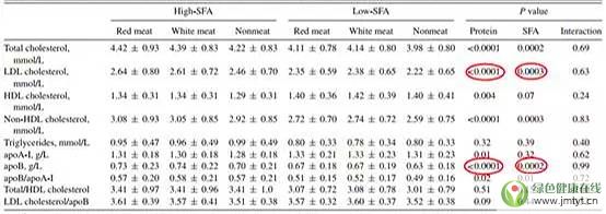 在基線飲食以及每階段飲食結(jié)束后收集受試者的空腹靜脈血樣本,用于血漿脂質(zhì)、脂蛋白顆粒亞組分、載脂蛋白和葡萄糖的重復(fù)分析。結(jié)果表明,食用紅肉和白肉的受試者的低密度脂蛋白(LDL)膽固醇和載脂蛋白B(apoB)顯著高于食用非肉類(lèi)蛋白的受試者,且不受SFA類(lèi)型影響。這主要?dú)w因于富含膽固醇大型LDL顆粒的增加,而小+中型LDL和總/高密度脂蛋白膽固醇水平不受蛋白質(zhì)來(lái)源影響。