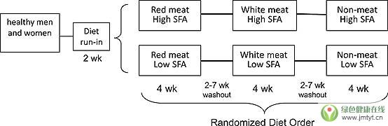 研究人員將113名健康人(年齡:21~65,體重指數(shù):20~35公斤/米2)分為高、低飽和脂肪酸(SFA)兩個(gè)隊(duì)列(61人和52人),每個(gè)隊(duì)列又分紅肉、白肉和非肉類(lèi)蛋白飲食三階段,每段飲食之間經(jīng)歷2~7周的洗脫期。受試者被隨機(jī)分配到低SFA(總能量為7%)或高SFA(總能量為14%)組之前,先進(jìn)行2周的基線飲食,以測(cè)試他們對(duì)受控飲食方案的依從性。其中紅肉和白肉飲食的主要來(lái)源分別是牛肉和雞肉,無(wú)肉飲食則主要由植物提供。