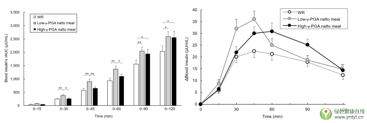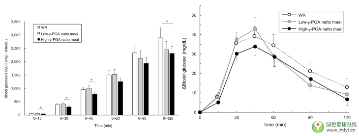 這項隨機對照交叉實驗納入20-64歲的健康志愿者20名,使用以下試驗餐:(1)WR(150克含48.5克碳水化合物的包裝大米),(2)低γ-PGA納豆粉(WR +低γ-γ-PGA納豆),和(3)高γ-PGA納豆粉(WR +高γ-PGA納豆)。在試驗餐負荷前和餐負荷后15、30、45、60、90和120分鐘,使用靜脈插管從靜脈抽取血液,計算血糖和胰島素水平曲線下的增量面積(IAUC),并在試驗餐之間進行比較。